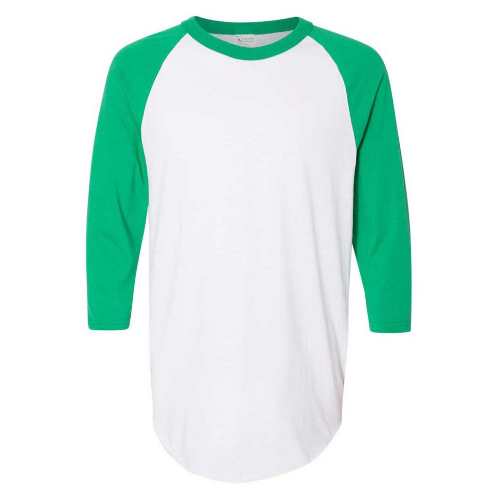 Custom uniforms have never been easier to create than with the Augusta Sportswear Men's White/Kelly Three-Quarter Raglan Sleeve Baseball Jersey. This classically designed raglan made of a polyester, cotton blend offers contrasting color rib collar and raglan sleeves for a creative look that will be an instant hit. Add a screen print of your company logo for company-wide events like softball or family games. The double needle hemmed sleeves add extra durability and the surged fishtail bottom provides extra coverage as you slide into home. For a fun twist, add a logo you design to give as gifts or to use as employee apparel where appropriate. Comfort, convenience, and style come together to create this jersey.Highlights