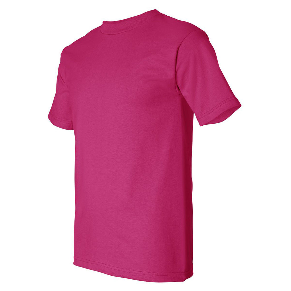 The Bayside Men's Bright Pink USA-Made Short Sleeve T-Shirt is more than just a T-Shirt, especially with your company's custom logo right there on the chest. The wide collar as well as the double-needle stitched sleeves and bottom hem put this shirt a cut above the everyday T-Shirt when it comes to fashion, and it would be a sharp company uniform. Available in a wide range of colors, your logo would blend in well regardless of its design. Or you could order different colors to give your employees a full uniform wardrobe. This logoed shirt also would be practical for company events such as trade shows.Highlights