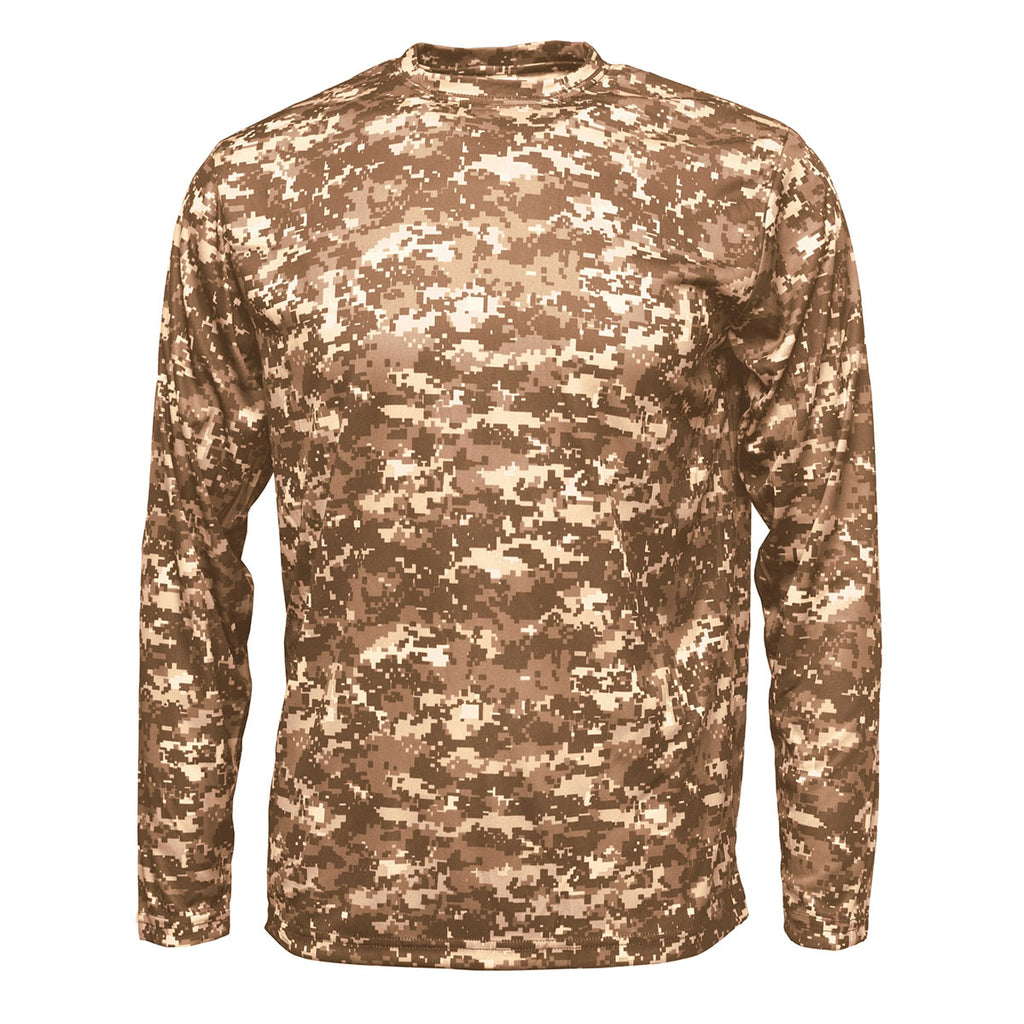 What could be more 'now' than a custom BAW Men's Desert Xtreme Tek Digital Camo Long Sleeve Shirt? And what could be better than a choice of different colors? This polyester shirt will be a favorite of the men who receive it. Every time they show it off they will be showing off your logo as well. It will be worn often because the fabric is so comfortable and has moisture wicking properties so it is very absorbent. The crew neck style has double needle hems which are very popular. Don't be surprised if current and prospective customers come back and ask for a second color 'for a friend'.Highlights
