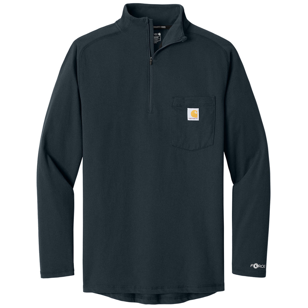 Upgrade to a custom Carhartt Men's Navy Force 1/4-Zip Long Sleeve T-Shirt. This midweight tee fights sweat and is built for hard work and play. Its stretch and UPF 25+ make it perfect for exploring the outdoors, with odor protection and quick drying. Place your order before these sell out.This product can only ship within the United States and Canada.