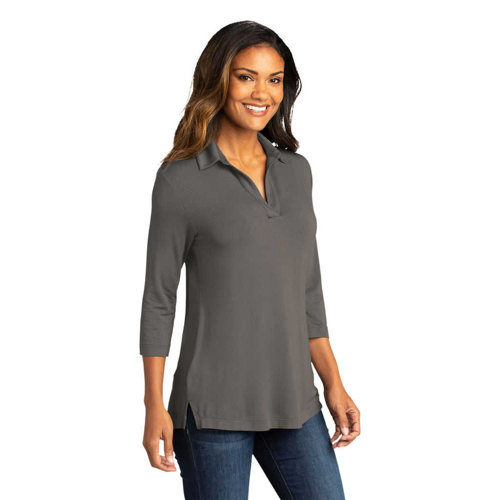 Look and feel great in a custom Port Authority Women's Sterling Grey Luxe Knit Tunic. The updated polo inspired tunic is longer than normal to provide extra coverage at work or play. The design and feminine fit with slight stretch keep you looking polished with a buttonless front placket and curved droptail hem. Easy to wear alone or pair with a blazar to create corporate apparel, you can add a company logo to make sure everyone is recognizable with the company. Try out a custom logo to add to your logoed apparel options.Highlights