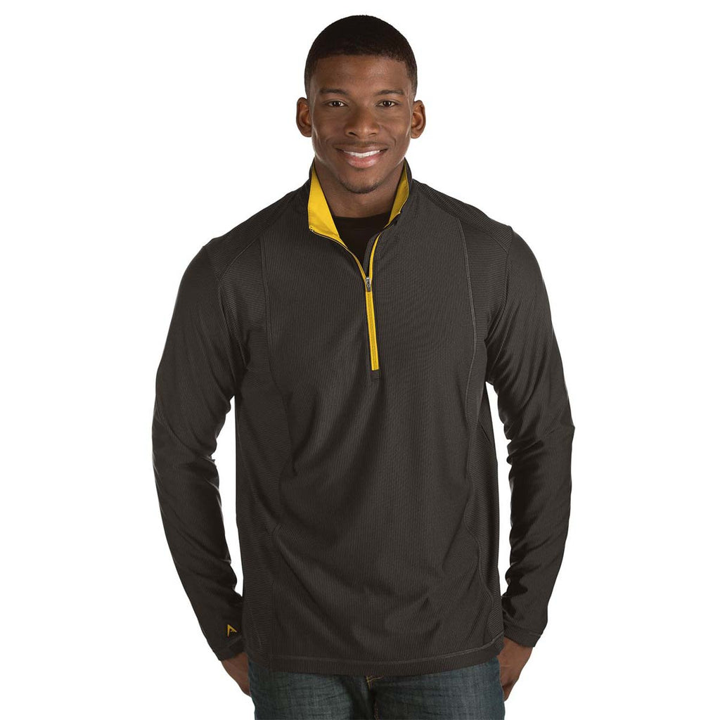 If you're looking for your next custom quarter zip look no further than the Antigua Men's Black/Gold Tempo Fine Stripe Quarter Zip. Wear the versatile layering piece to work and after the workday when you tee off at your favorite golf course. The jacket is comfortable for all day wear, and has high quality construction to ensure it keeps its look after frequent use. Add your company on the large imprint area to take your brand to the next level. Your employees are sure to love this Antigua quarter zip. Your brand awareness will benefit from the daily wear of this embroidered layering piece.Corresponding Women's Style: Antigua Women's Black/Gold Tempo Fine Stripe Quarter Zip