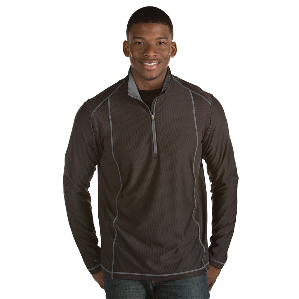 If you're looking for your next custom quarter zip look no further than the Antigua Men's Black/Steel Tempo Fine Stripe Quarter Zip. Wear the versatile layering piece to work and after the workday when you tee off at your favorite golf course. The jacket is comfortable for all day wear, and has high quality construction to ensure it keeps its look after frequent use. Add your company on the large imprint area to take your brand to the next level. Your employees are sure to love this Antigua quarter zip. Your brand awareness will benefit from the daily wear of this embroidered layering piece.