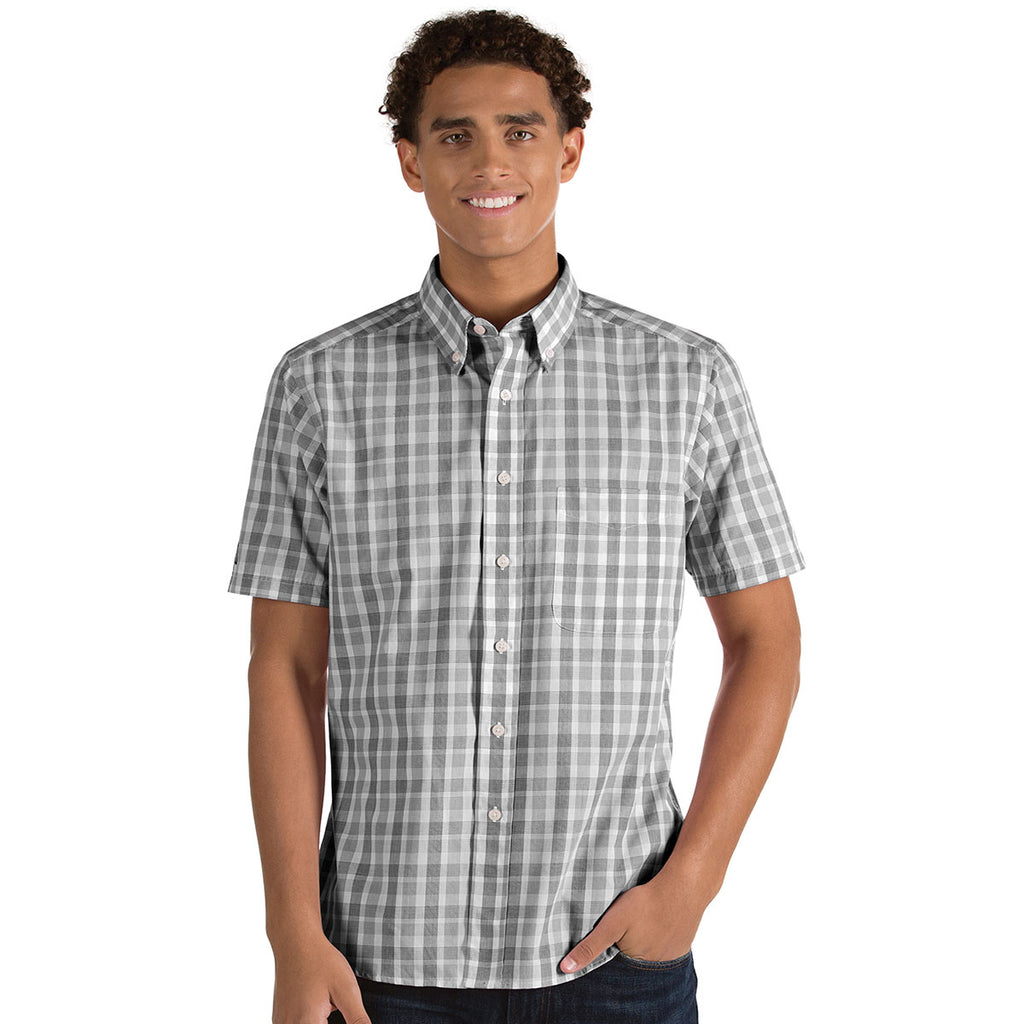 Classic design with a bit of flair is found in the Antigua Men's Black/White Crew with plaid color options. Made of a cotton, polyester blend the button down collar and tail bottom allows for the professional or laid back look to be accomplished with a single garment. Add a custom logo or corporate embroidery to use this button down as a part of employee apparel or keep your chosen employees and yourself looking top-notch at the next trade show. Offering a professional look that can be dressed up or down, the open cuffs and self fabric chest pocket are the small details that make a real difference. Place your order today!Highlights