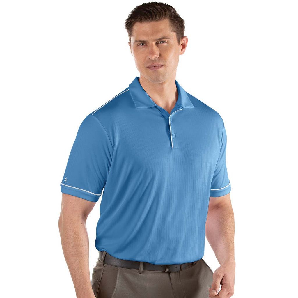 The embroidery logoed Antigua Men's Columbia Blue/White Salute Polo comes in seven classic colors and exudes style from top to bottom. Some of the extraordinary must-have features of this polo shirt include a comfortable 100% polyester fabric, Desert Dry moisture wicking technology, self-fabric collar featuring an open cuff, three-button closure, and contrast tipping at the placket, forward shoulder, and cuff seam. This stylish men's polo is an excellent corporate apparel wear gift to hand out at trade shows, golf events or recruiting events. As an extra-special feature, your embroidery logo will look fabulous on this exquisite shirt.Corresponding Women's Style: Antigua Women's Columbia Blue/White Salute Polo