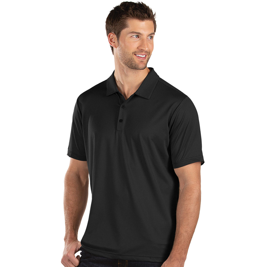 Add embroidery to the Antigua Men's Black Multi Balance Short Sleeve Polo Shirt to enjoy a unique look at golf events or executive golf meetings. The polyester spandex blend has a bit of stretch so your swing will not be interrupted and the gingham pattern jacquard design with Desert Dry keeps you looking your best. Add a company logo to use as employee apparel or corporate wear as needed. The short sleeve polo looks just as amazing on the back nine as in the mailroom or on the sales floor. Place an order today to make sure these polos are ready as soon as possible.Corresponding Women's Style:Antigua Women's Black Multi Balance Short Sleeve Polo Shirt