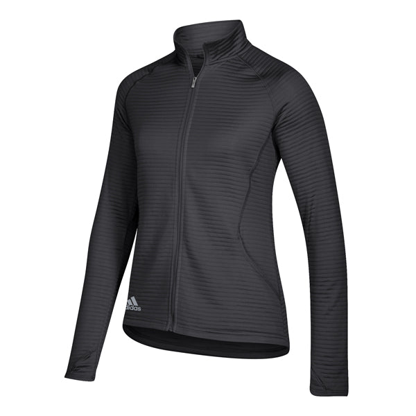 When you need to increase mobility to soar above the competition, put on the custom logoed adidas Women's Black Essentials Textured Full Zip. Raglan sleeves give you more room to move the arms higher for golf shots and extend the arms to generate more power at the plate. Two stripes on each sleeve create added style to draw the attention of the professionals you meet at industry trade shows. Make the attention pay off by attaching your corporate logo on the large imprint area. The rugged fabric resists the types of rips and tears that diminish the quality of other types of athletic apparel.