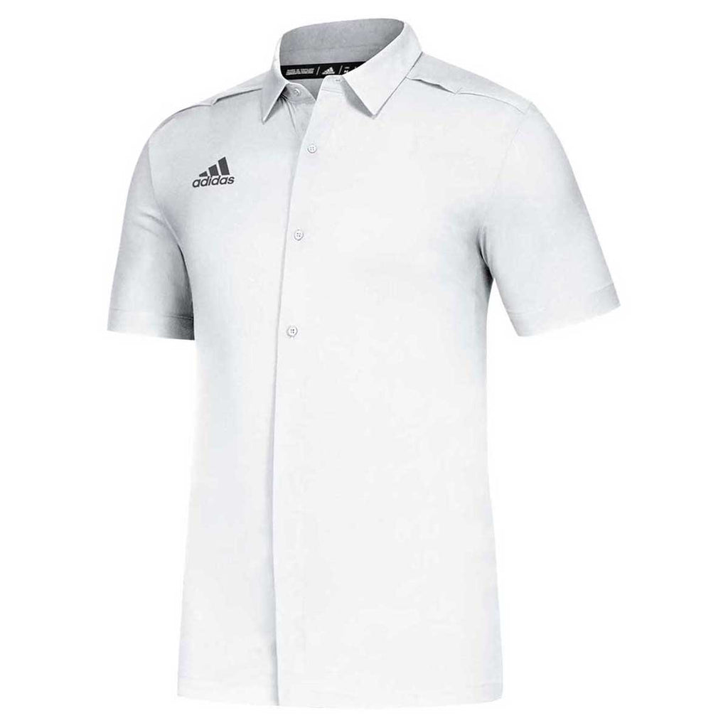 Polos are a must have in the corporate world. Create an embroidered, personalized look with the adidas Men's White/Grey Five Game Mode Full Button Polo in 4 color options. Made of plain weave recycled polyester with a clean finished collar and concealed stay, this polo can easily go from the corporate world to a backyard BBQ. Add an embroidered corporate logo to offer these as employee gifts or use them as part of work wear uniforms. The rubberized adidas logo rests on the right chest as a sign of true quality on this long lasting polo that stays looking neat with a full button front.