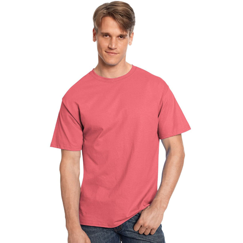 Custom logoed Hanes Men's Charisma Coral 6.1 oz. Tagless T-Shirt will be an instant favorite at all your recruiting events. Available in 47 different colors, your screen print will pop to grab the attention of passersby. Made of 100% ComfortSoft cotton, the tag free neck label and lay flat collar make this t-shirt the ultimate in comfort. Ideal as employee apparel for those that are working hard for the company or as a form of recognizable advertising at recruiting events. These t-shirts are so comfortable people will want to wear them daily, even outside of work. Place your order today to be prepared for the next big event.Highlights