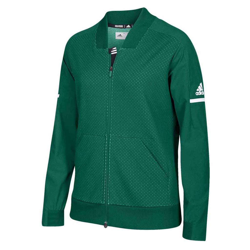 Head outdoors in a custom designed adidas Women's Dark Green/White Squad Bomber with your choice of company or corporate logo. The recycled polyester and cotton mesh blend jacket offers polyester rich elastane sleeves that are water resistant and comfortable to wear. The regular fit means this jacket is easy to layer of a tank or tee and can be used as part of a uniform or as warmup gear for the next team event. The type of jacket everyone imagines when thinking of athleisure wear this bomber makes a great employee gift for any occasion. Place an order soon to add these bombers to your wardrobe.