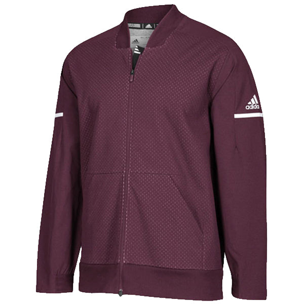 adidas Men's Maroon/White Squad Bomber Jacket with custom design offer a vintage feel in an updated look. Created from recycled polyester and cotton on the body, this bomber jacket truly is the bomb. Whether you want to get noticed at the next athletic related event or just want a jacket to show off going to and from the office, this custom embroidered jacket is a must have. Offer these bombers as high end corporate gifts with water resistant sleeves and zippered pockets for easy wear. Place an order for one or for many to make a real statement that will get you noticed.