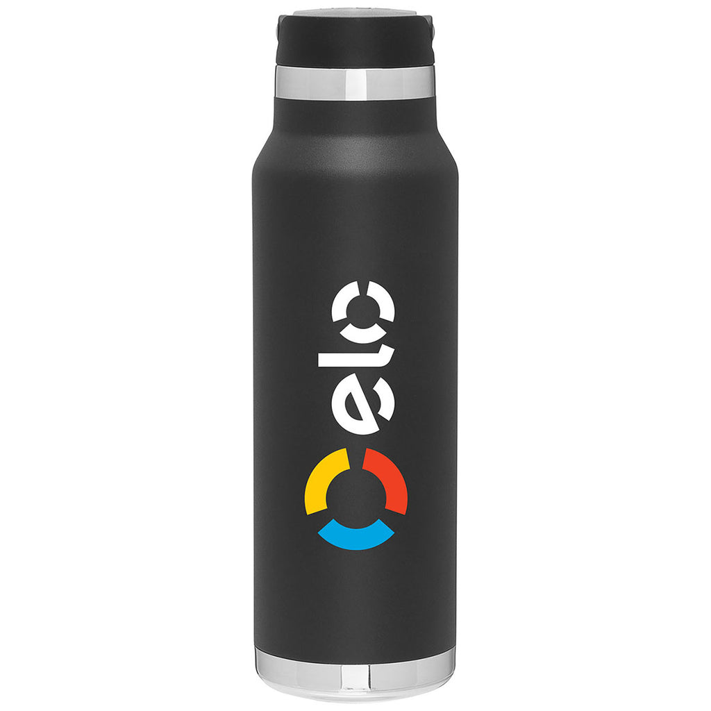 Keep your team plenty hydrated by providing them with a H2Go Matte Black 25 oz Voyager Bottle that displays your company or team's custom logo. The sleek design and powder coated finish give it a timeless look that will never go out of style, while copper vacuum insulation means the drink inside will always remain at an ideal temperature.