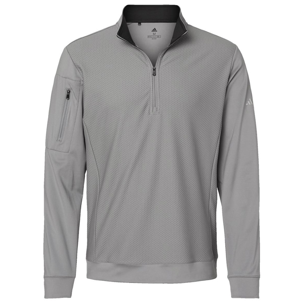Sleek, stylish, and fashion forward describe the custom embroidery Adidas Men's Grey Three Performance Texture Quarter Zip. Made of a medium weight polyester, elastane interlock blend with hydrophilic finish this quarter zip is ideal as warm-up athleisure apparel or just to wear as you run errands. The textured front body with solid jersey sleeves allows for all day comfort. A right arm zipper pocket is great for small items. Add a custom logo to use as an employee gift or simply add to the wardrobe of friends and family. The UPF 50+ protection makes this perfect for enjoying the great outdoors.