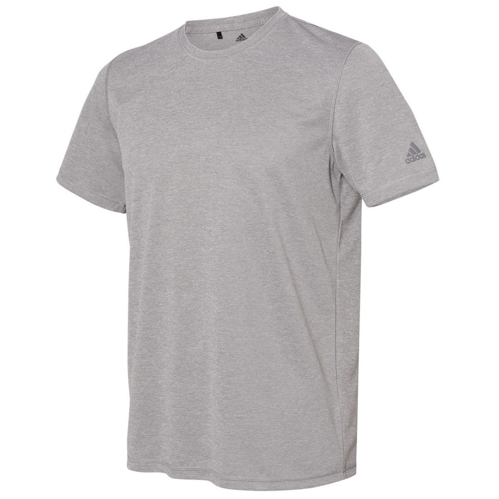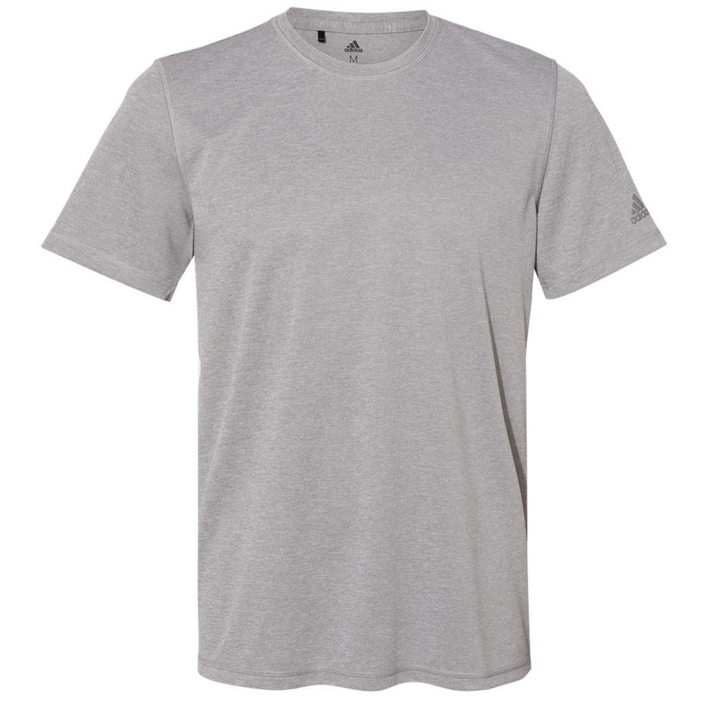 Stay comfortable and look great in a screen print Adidas Men's Grey Three Heather Sport T-Shirt. Ideal for the gym, a day with the family, or a quick round of golf, this 100% recycled polyester pique tee is good for the environment and great for you with UPF 50+ protection. Add a company logo to use these as employee apparel that will stand up to hard work or a corporate logo to use for corporate events as a way to showcase your company or organization. The crewneck design with open hem sleeve is designed for all day comfort whether worn alone or layered for warmth.