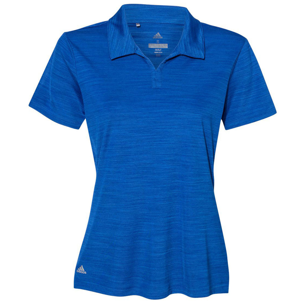 Make a custom statement with the Adidas Women's Collegiate Royal Melange Sport Polo in a range of colors and sizes. Created from 100% recycled polyester with striated heather interlock, this polo is a must have for both home and office. Add a custom logo to use as employee apparel that will look good and be easy to wear during long work hours. A self collar with fashion V-neck placket adds a bit of style to the polo design and the contrast Adidas logo on the right hip screams quality. A corporate embroidery allows this to be an option for corporate apparel whether paired with a jacket or worn alone as a statement piece.