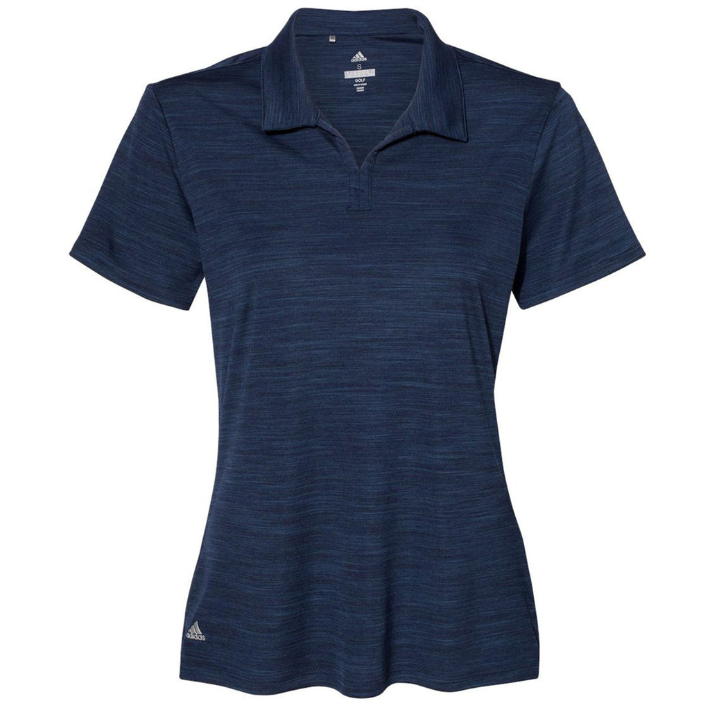 Make a custom statement with the Adidas Women's Collegiate Navy Melange Sport Polo in a range of colors and sizes. Created from 100% recycled polyester with striated heather interlock, this polo is a must have for both home and office. Add a custom logo to use as employee apparel that will look good and be easy to wear during long work hours. A self collar with fashion V-neck placket adds a bit of style to the polo design and the contrast Adidas logo on the right hip screams quality. A corporate embroidery allows this to be an option for corporate apparel whether paired with a jacket or worn alone as a statement piece.