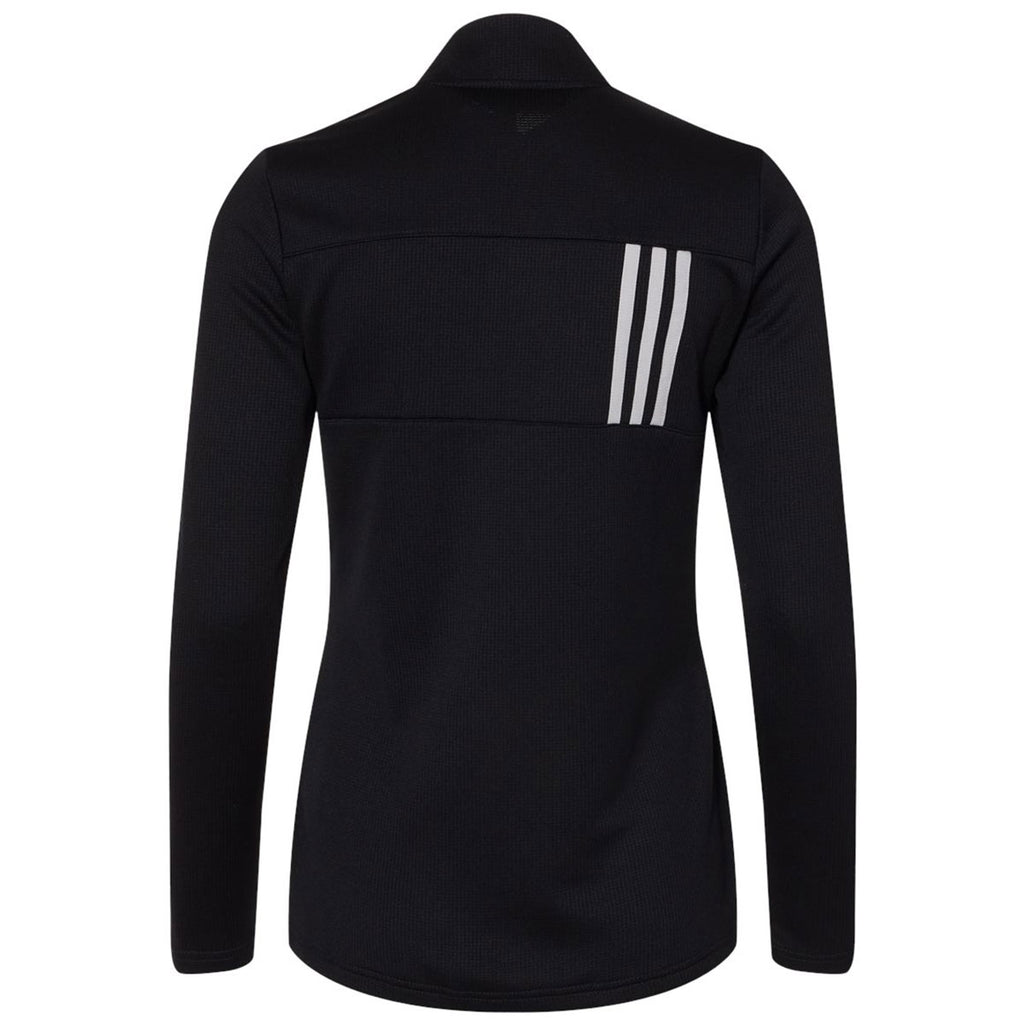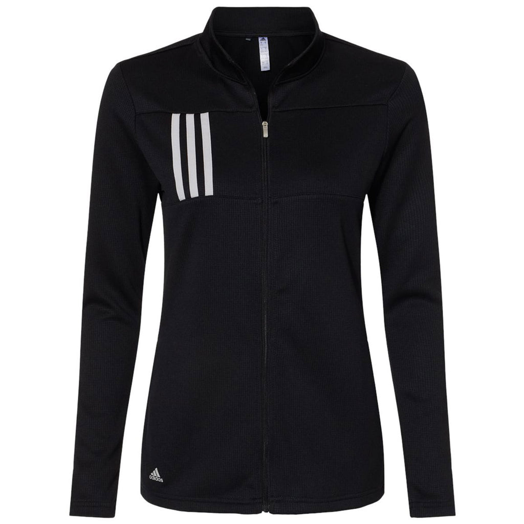 Your custom logo will stand out on the adidas Women's Black/Grey Two 3-Stripes Double Knit Full-Zip made of 100% recycled polyester. The beautiful waffle texture knit construction has a self-collar and moisture management properties to keep you looking and feeling your best as you go about your day. Add a company logo to offer as employee gifts or as a unique choice for employee apparel. The full zip style allows for easy on and off of the double knit whether you are headed out on your morning commute or going for a jog in the park.