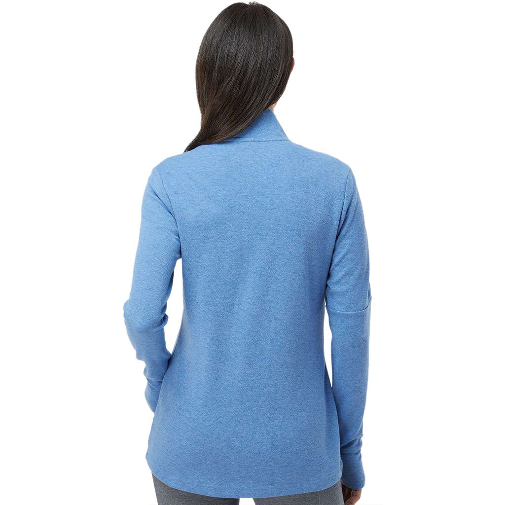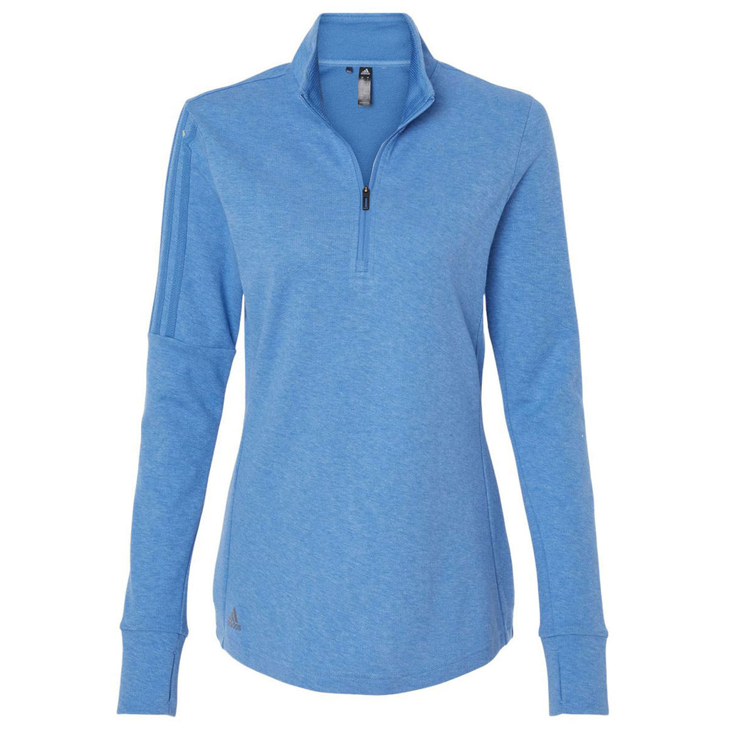 Women who love getting active will appreciate the functionality of the adidas Women's Focus Blue Melange 3-Stripes Quarter Zip Pullover. Made from a special moisture-wicking fabric, this hooded sweatshirt features a sleek silhouette and a variety of on-trend color options. All it's missing is your company's custom logo or design.