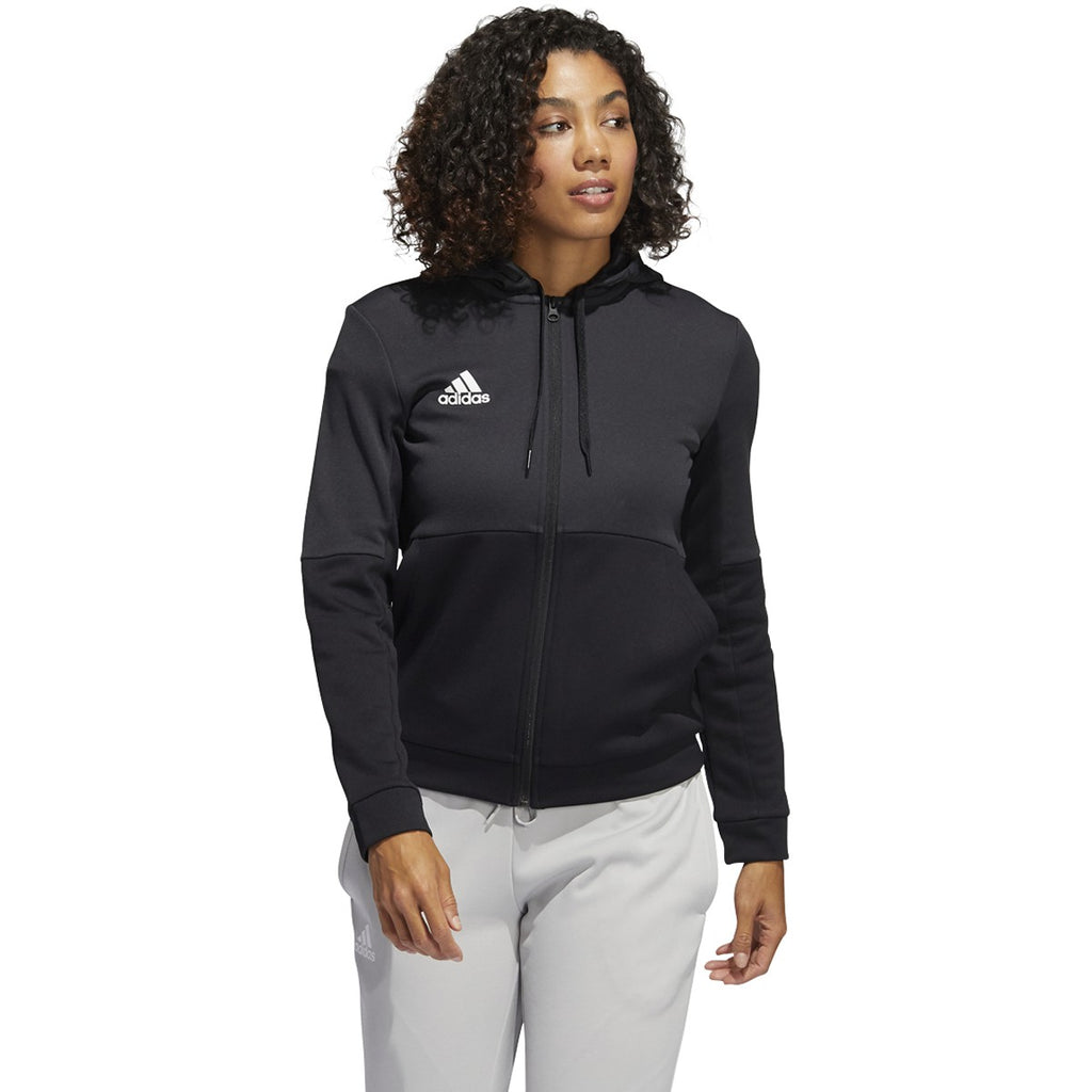 Enjoy a custom logo on the Adidas Women's Black/White Team Issue Full Zip Jacket that can serve a multitude of purposes. This versatile full zip is made of partial recycled materials and absorbs moisture for all day comfort. Layer over a tee or tank for a morning run, then enjoy after to keep muscles from getting cold too fast. Add embroidery to create a team uniform piece that can be worn year round or a company logo to give these as employee gifts. The Adidas logo appears on the right chest area to demonstrate quality. A hood with drawstring and two front pockets complete the look on this sleek jacket that everyone can love.