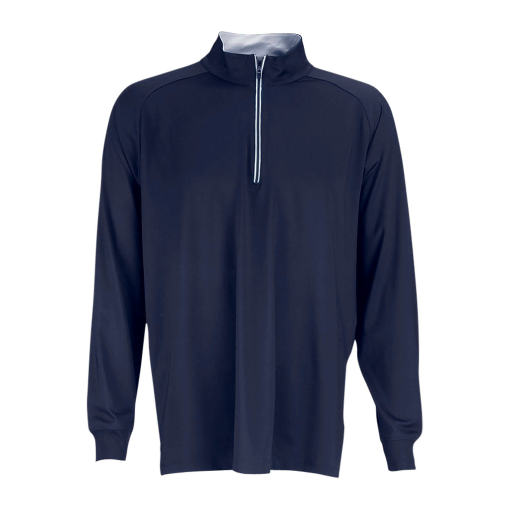 With a mock neck and contrast inner collar, the embroidered Greg Norman Men's Navy Play Dry 1/4-Zip Performance Mock sets the standard for corporate apparel. Stretch fabric increases your movement flexibility, which also increases your comfort level. UV protection ensures you retain healthy skin and Play Dry moisture management technology dries the skin every time you put on the performance mock. Rugged polyester prevents rips and tears from diminishing the quality of the all-purpose active wear. Add your corporate logo to send the message that your company stands for delivering high-quality products and services.Corresponding Women's Style: Greg Norman Women's Navy Play Dry 1/4-Zip Active Pullover