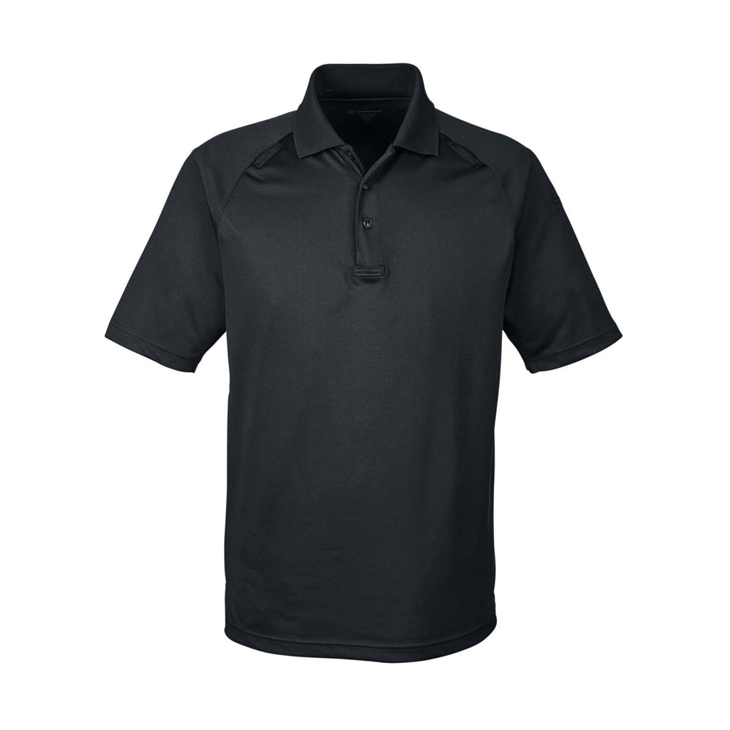 Harriton Men's Black Tactical Performance Polo Shirt combines structure, adaptability, and mobility. It is built for tough performance and resists snagging, pilling and picking. Featuring a matching flat knit collar, three-button placket and two mic clips, you can dress it up with pants or under jackets for that spruced up look. Antimicrobial wicking fabric keeps you dry and comfortable to help maintain a professional appearance. A drop-tail hem makes for superior back coverage during quotidian tasks while strategic side slits provide unhampered mobility. Outfit your company or brand with confidence by picking this customizable polo shirt.Corresponding Women's Style: Harriton Women's Black Tactical Performance Polo