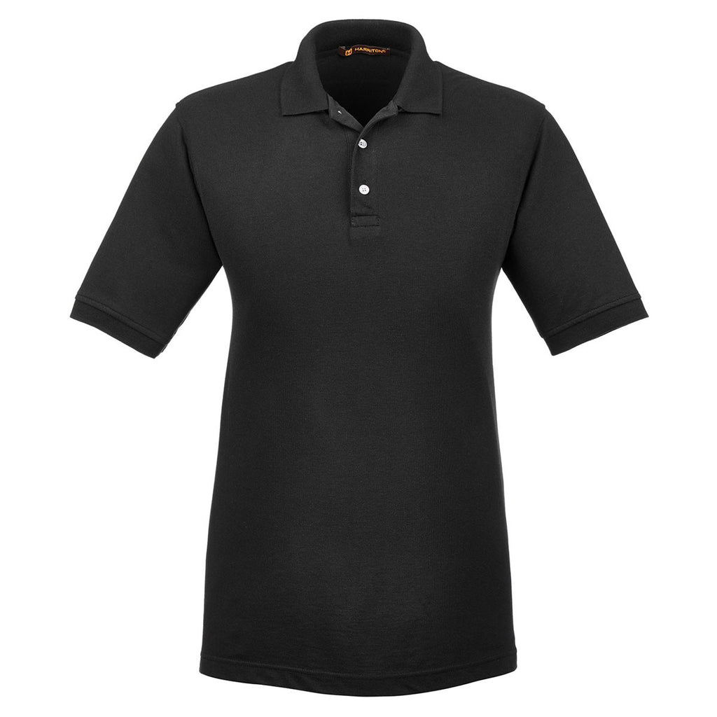 Thirty-five percent cotton pique and 65% rugged polyester pack a powerful fashion punch for the Harriton Men's Black 5.6 oz. Easy Blend Polo. The wrinkle resistant polo looks as fresh at the end of the day as it did the first thing in the morning. Blended cotton and polyester prevents the shrinkage that sends other types of polos to thrift stores. Set-in sleeves exude high fashion, while the hemmed bottom and side vents create a unique look that will grab the attention of everyone you meet. Attach your company logo to the large imprint area to take advantage of all the attention.Corresponding Women's Style: Harriton Women's Black 5.6 oz. Easy Blend Polo