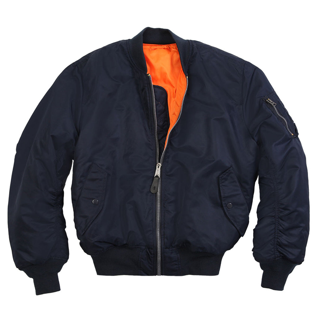 The most popular jacket from Alpha Industries, now with your own custom logo attached. The Alpha Industries Men's Replica Blue MA-1 Flight Jacket is a perfect fit for corporate gifting or events. There are multiple features that are immediately recognizable, from the Remove Before Flight tag to the snap-closure pockets. You can take advantage of the additional recognition by adding your logo to the timeless style of an Alpha Industries MA-1 jacket. The MA-1 was the first military jacket to cross over into civilian fashion. The style isn't the only thing you can count on with this jacket. The quality construction that dates back to the 1950's is sure to keep this jacket around for a long while.Highlights