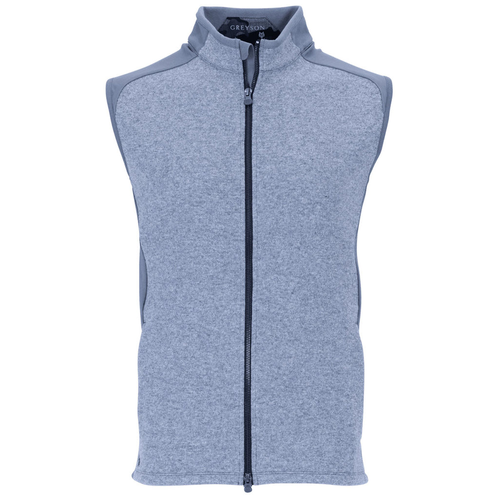 Greyson Men's Light Grey Heather Sequoia Luxe Vest with a custom logo is an essential layering piece for those chilly outdoor adventure days. The full zip vest is constructed for function and style with stretch, quick dry, and antimicrobial properties for all-day wear. Great for hiking, skiing, and other outdoor fun. Place an order today.