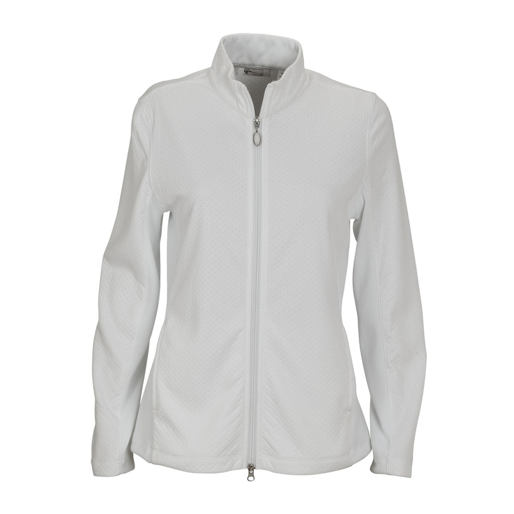 As one of the most versatile jackets for women, the embroidered Greg Norman Women's White Embossed Dot Jacket comes with an embossed interlock body that will be the talk of the next outdoor civic event. Add your corporate logo on the large imprint area to give everyone you meet at civic events something else to discuss. Highly durable polyester resists the types of rips and tears that relegate other styles of corporate apparel to a Salvation Army drop box. Reverse fabric blocking at the underarms presents a chic appearance that complements the brilliantly designed dot pattern.Highlights