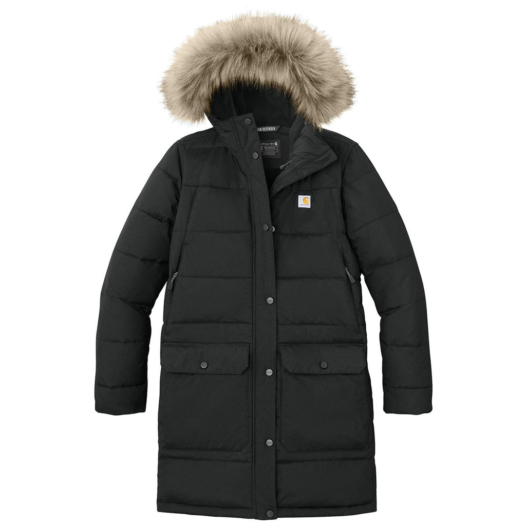 The custom Carhartt Women's Black Montana Insulated Hooded Coat delivers dependable warmth with rugged durability. Designed to withstand cold weather, this insulated coat is perfect for work or everyday wear. Add your branding to create a corporate piece that's both practical and stylish. Its reliable protection and quality craftsmanship make it an excellent choice for employees or promotional apparel.