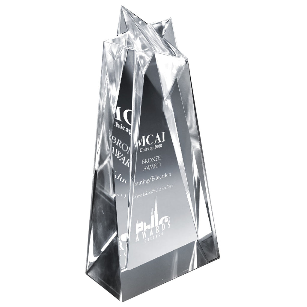 Get creative with a custom logoed Hit Clear Medium Star Sculpture Award with laser engraving. The star-shaped design of this award is beautiful to behold and display. Available in three different colors, the award is ideal for student awards, sporting event MVPs, and much more. Make sure you order in time for your next event.