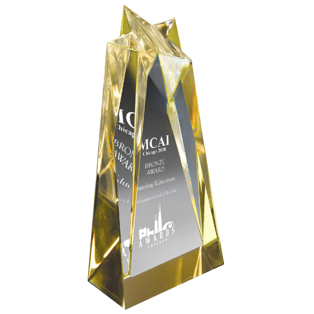 Get creative with a custom logoed Hit Gold Medium Star Sculpture Award with laser engraving. The star-shaped design of this award is beautiful to behold and display. Available in three different colors, the award is ideal for student awards, sporting event MVPs, and much more. Make sure you order in time for your next event.