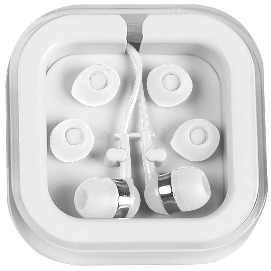 Enjoy Hit White with White Earbuds In Case with a corporate logo to share as gifts or with clients and potential customers. These simple earbuds come in their own case and are easily connected to most phones or computers as needed. Available in White or blue with interchangeable earbud covers, these are sure to be a crowd favorite.