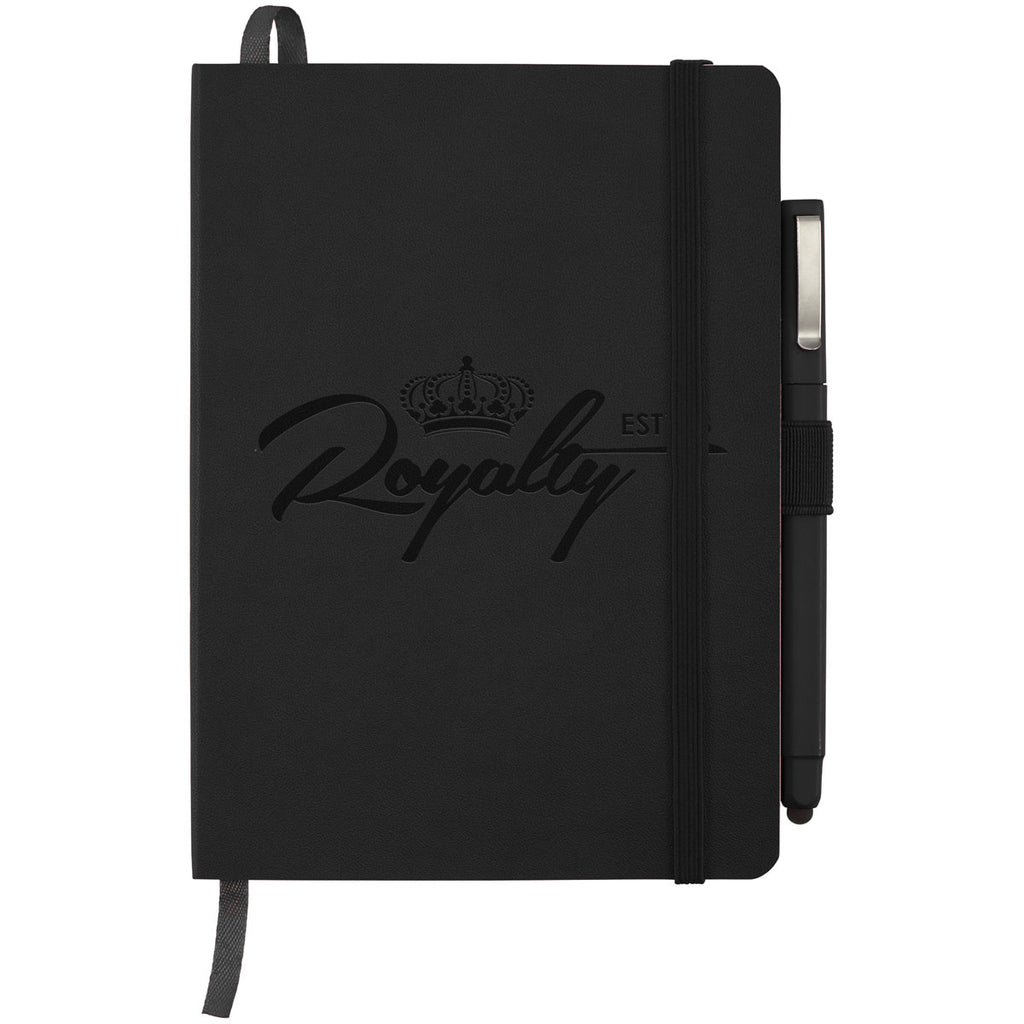 - Pricing includes one logo debossed or one color print on notebook. As well as one color logo printed on stylus.