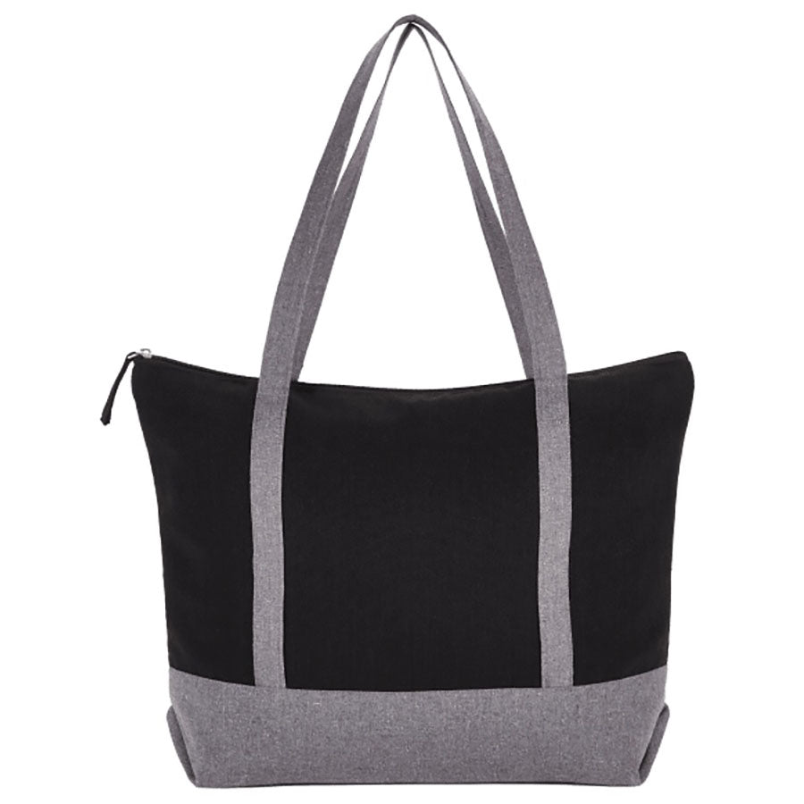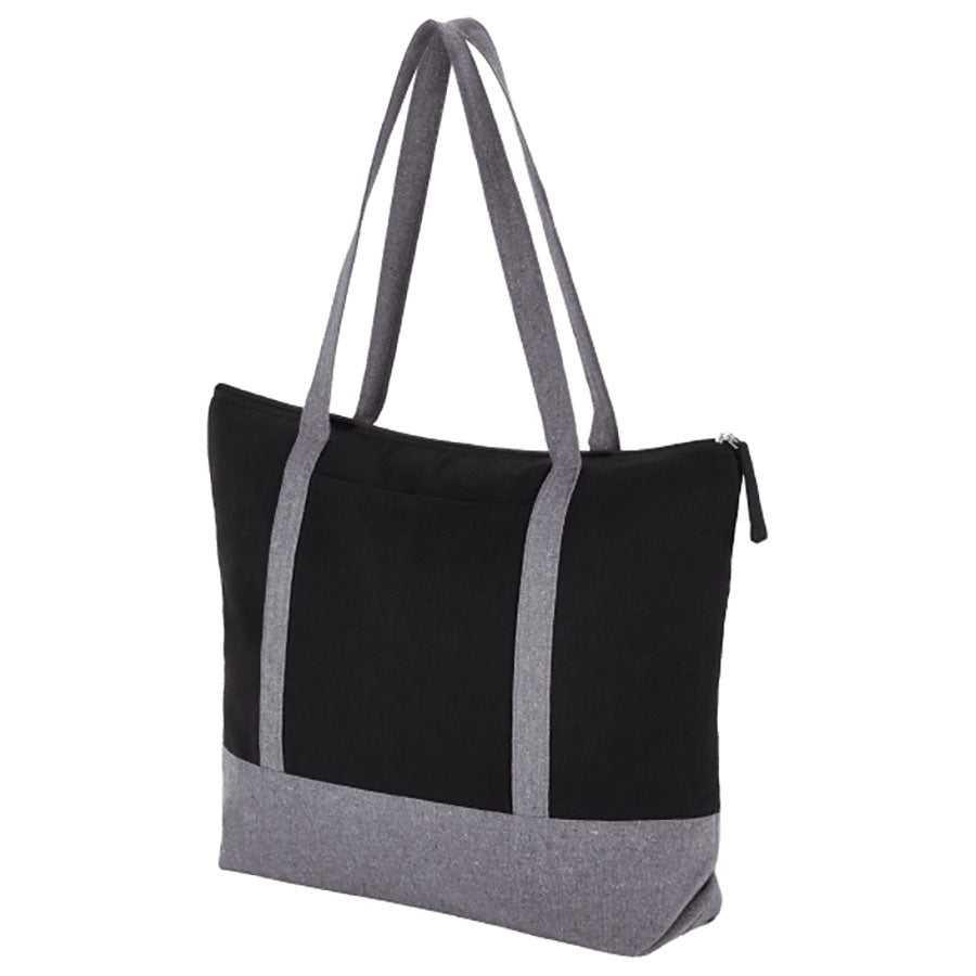 Upgrade your product lineup with the Repose 10oz Recycled Cotton Zippered Tote-an eco-friendly choice that combines sleek style with practical functionality. Crafted from durable 10oz recycled cotton, this black tote combines eco-friendliness with modern style. The larger zippered main compartment ensures secure storage, while the on-trend color-blocking design adds a fashionable touch. With a 10.5" handle drop and an 8" x 7.5" front slash pocket, it offers both convenience and functionality. The spacious size of 13.50" H x 18.25" W x 4.00" D makes it perfect for carrying a variety of items. Stock up now and offer your customers a tote that stands out for its durability and modern design, perfect for their local market needs!