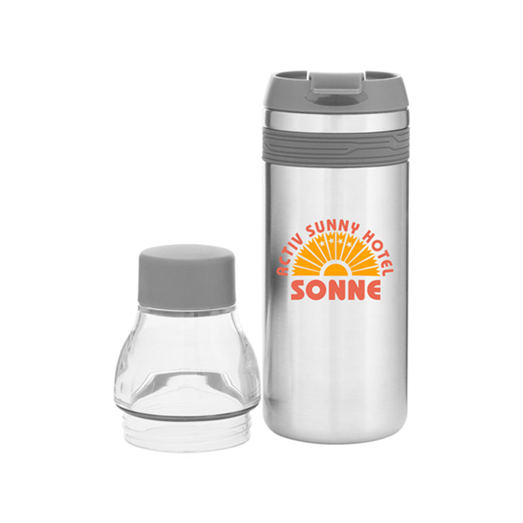 Show your creativity with a custom H2Go Steel Orion. This unique stainless steel double-wall thermal tumble comes with a screw on top to easily convert it to a bottle. Easily commute with your tea, coffee, or water. Ideal as a gift or prize as this comes with a gift box. Use this thermal tumble to promote your next charity event or sale.