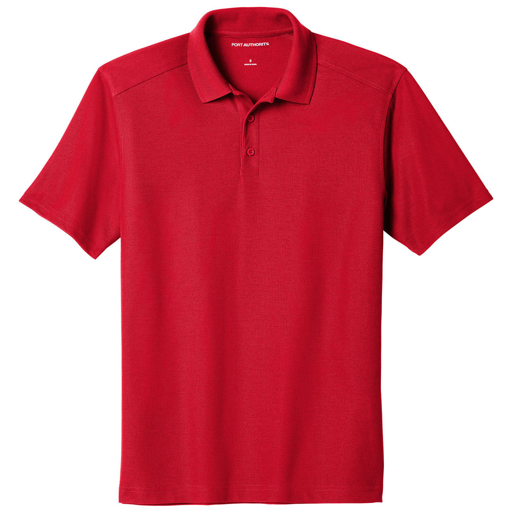 Paired with EZCotton polos, the custom logoed Port Authority Men's Apple Red EZPerformance Pique Polo raises the standard for employee apparel. Incredibly smooth 100% spun polyester pique remains in pristine condition for years to come. The flat knit collar presents a relaxed fit that will help your team settle into a professional networking event. Add your company logo on the large embroidery area to connect with other professionals at business conventions. With a logo, you put your best marketing foot forward to attract new customers for your business. Dyed-to-match buttons add a subtle chic touch for the pique polo.Corresponding Women's Style: Port Authority Women's Apple Red EZPerformance Pique Polo