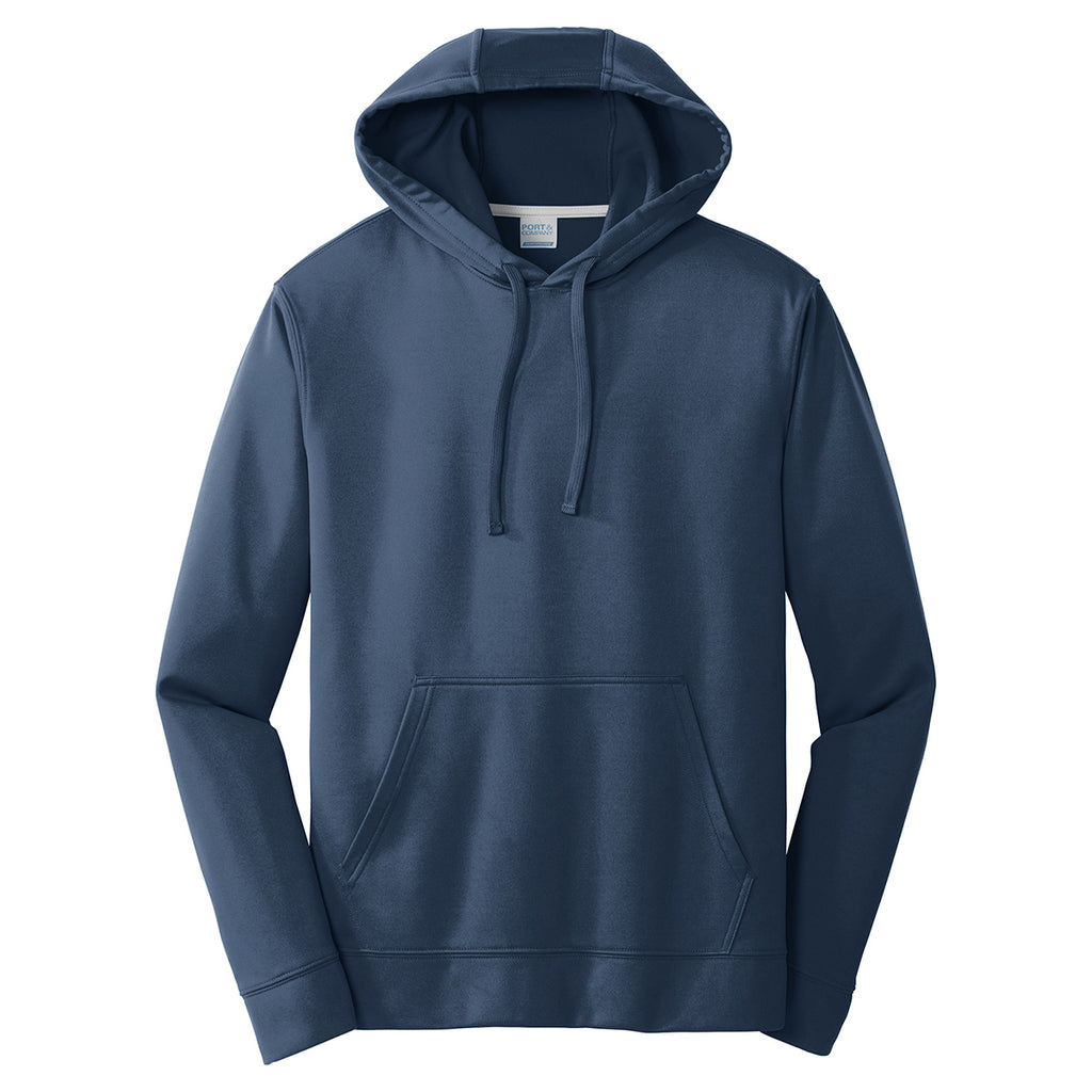 Active professionals love wearing the custom logoed Port & Company Men's Deep Navy Performance Fleece Pullover Hooded Sweatshirt. The ideal corporate apparel for wearing to casual company events includes a large imprint area for attaching your printed logo. Rugged polyester withstands the punishment delivered by participating in competitive recreational events throughout the year. Proprietary Dry Zone technology wicks away moisture to ensure comfort all day long. The three-panel hood comes with draw cords to protect your head against cold, windy weather conditions. This hoodie from Port & Company is sure to be a new employee favorite.Highlights
