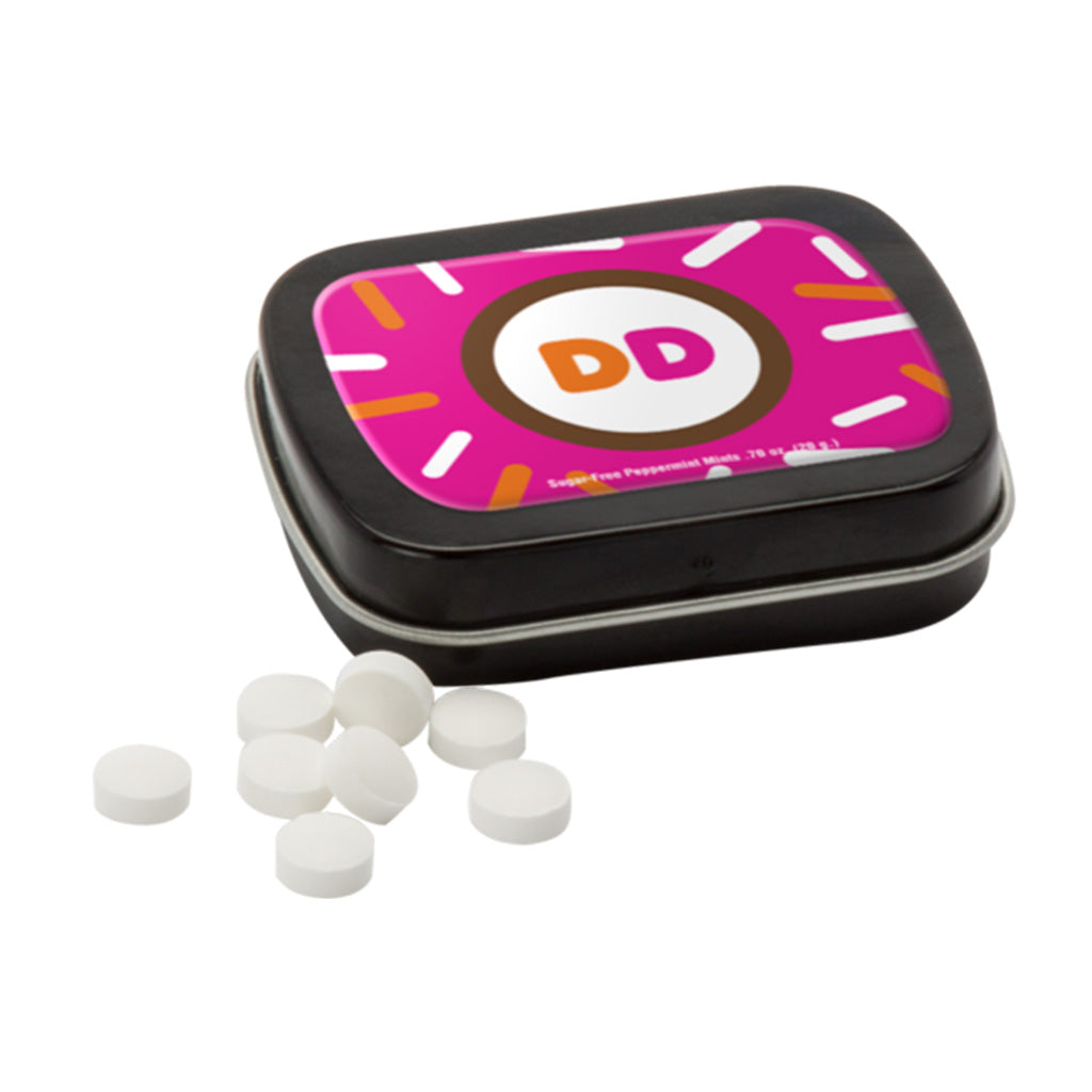 Sugar Free Mints in a Small Rectangular Hinged Tin with a custom logo is a simple and memorable way to advertise your company or organization. Add a custom design to use this tin as a handy giveaway at a trade show, specialized event, or company picnic. Place your order right away.