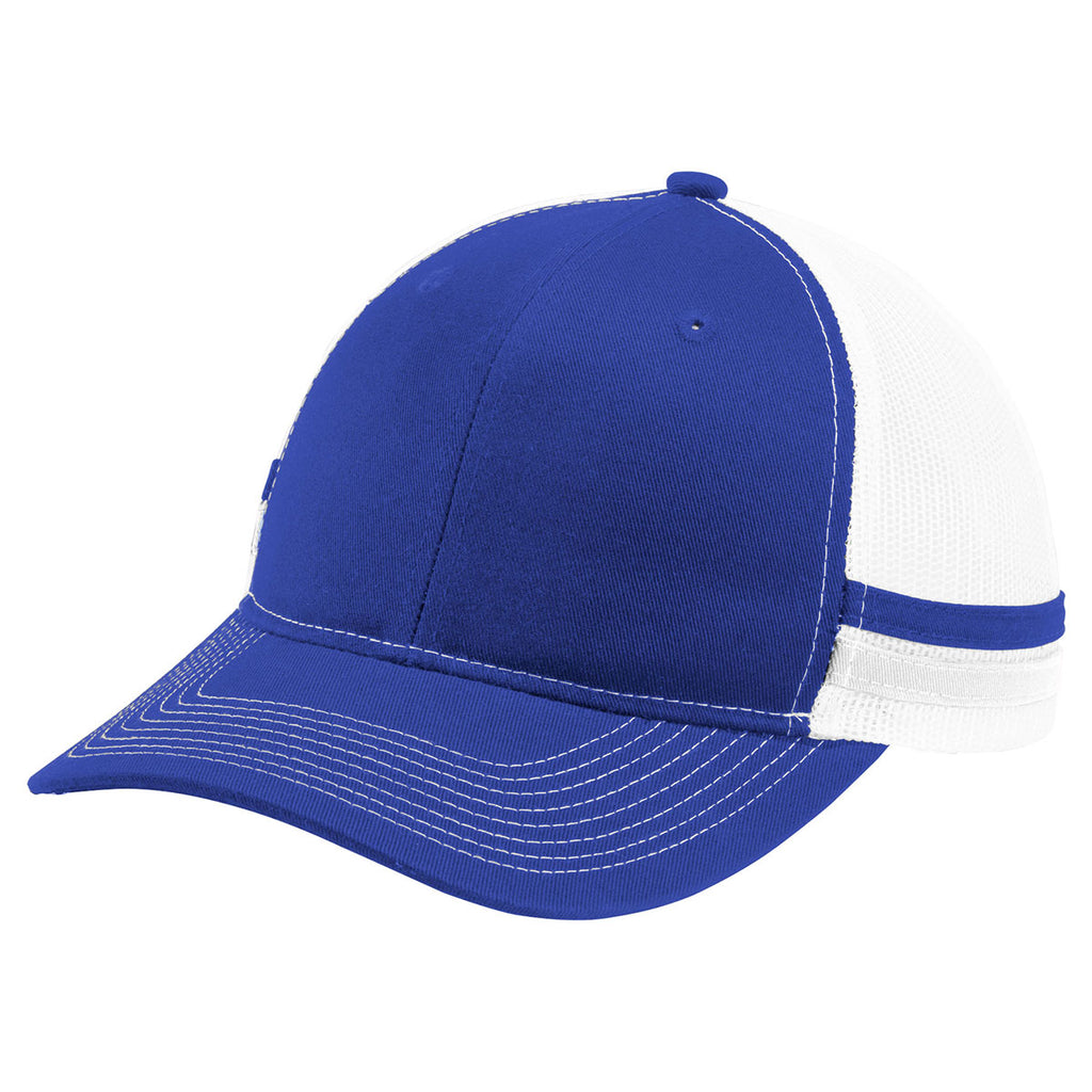 For clothing to give away at company events, turn to the structured look and feel of the Port Authority Patriot Blue/White Two-Stripe Snapback Trucker Cap. Designed with double stripe detail to create an old school look, the chic cap features a seven-position adjustable snap that allows every member of your corporate team to discover the optimal fit. The mid profile cap keeps enough of the sun out of your eyes to allow you to track down fly balls hit during corporate softball tournaments. Add a custom logo on the embroidery area to stir interest in your company during business trips.Highlights