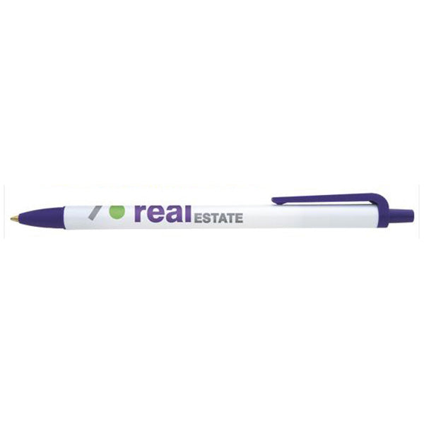 Good Value Purple with Blue Ink Contender Pen with a corproate brand is a cost effective way to showcase your brand or organization for the entire use of the pen. The practical design of this pen with a white barrel and contrasting trim means your name or logo will be the star. Great for giveaways, new clients, or general daily use. Order today.