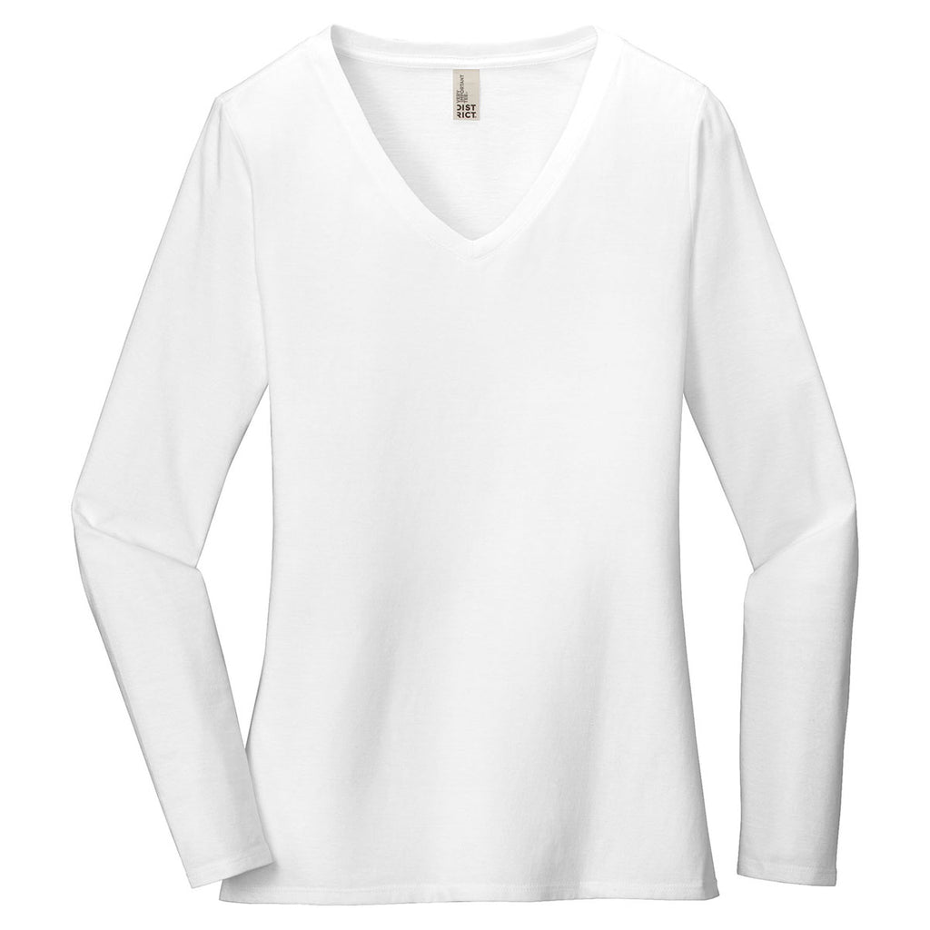 Before the next job fair, turn the corporate recruiting event into a display of fashion expertise by ordering the screen printed District Women's White Very Important Tee Long Sleeve V-Neck. The multi-use long sleeve tee works as well as standalone corporate apparel at a casual restaurant, as it does as the first layer of a cold weather fashion ensemble worn on a weekend camping trip. One-hundred percent ring spun cotton feels soft against the body. Add a custom logo to connect with potential customers at civic events. The long sleeve v-neck tee is the ultimate company giveaway.Highlights