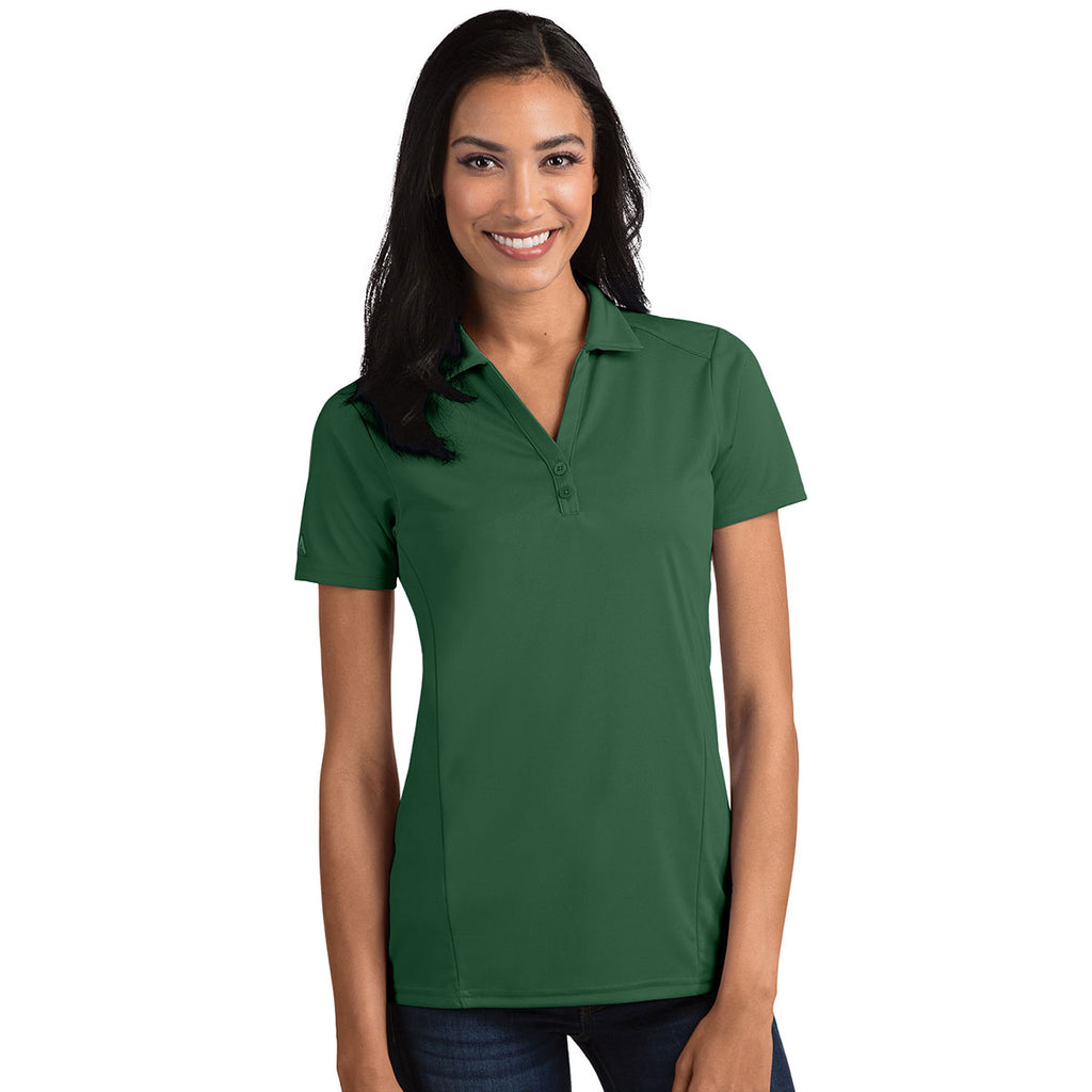 Look great while keeping cool in the Antigua Women's Dark Pine Tribute polo made of 100% polyester. Available in a wide variety of colors and sizes, this Desert Dry moisture wicking knit solid will carry your custom logo with pride and flair. Choose the custom embroidery that best fits your company and offer these shirts as employee apparel for those working in your office or the next trade show. Perfect for nearly any recruiting event, this polo would make a great gift or a go-to choice with 2-botton Y-placket, princess seams, and an open cuff. The possibilities are only as limited as your imagination. Place your order today in time for the next event.