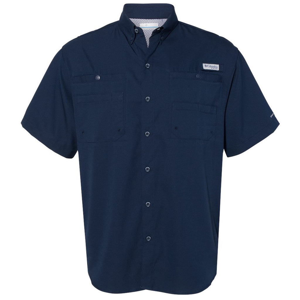 Head to the lake with a custom Columbia Men's Collegiate Navy PFG Tamiami Short Sleeve Shirt. This shirt is designed for fishing and outdoor fun with durable material, sun protection, a built-in rod holder, and much more. Perfect for outdoorsman shops and those who enjoy taking part in outdoor adventures. Order today.This product cannot ship outside of the United States.