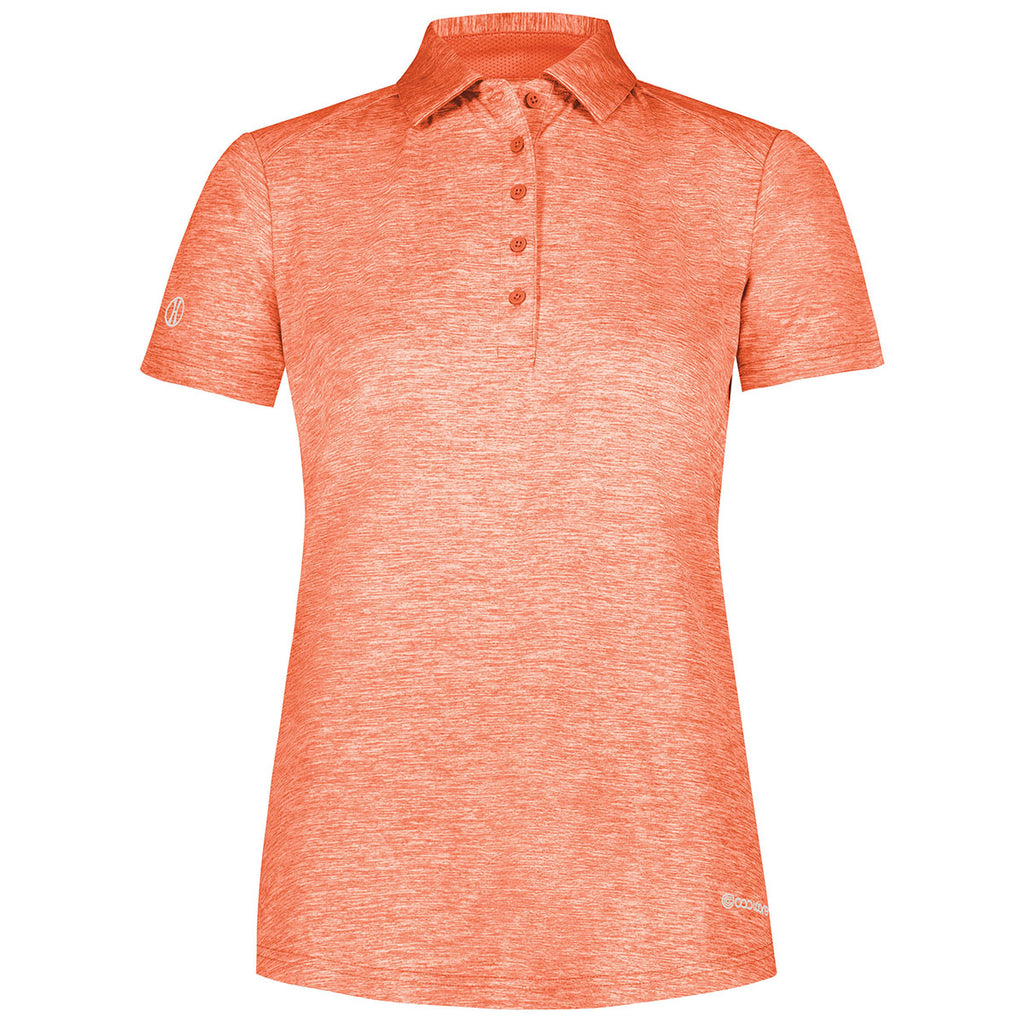 Holloway Women's Orange Heather Electrify Coolcore Polo can be embroidered with a custom logo of your design. The short-sleeved polo offers a classic look with a longer back for modesty and all-day comfort. Easy to dress up for the office with a blazer or be more casual when worn alone with shorts, jeans, or slacks, this polo is an all-around garment that is as comfortable in the boardroom as the clubhouse. Place an order today.Corresponding Men's Style: Holloway Men's Orange Heather Electrify Coolcore Polo