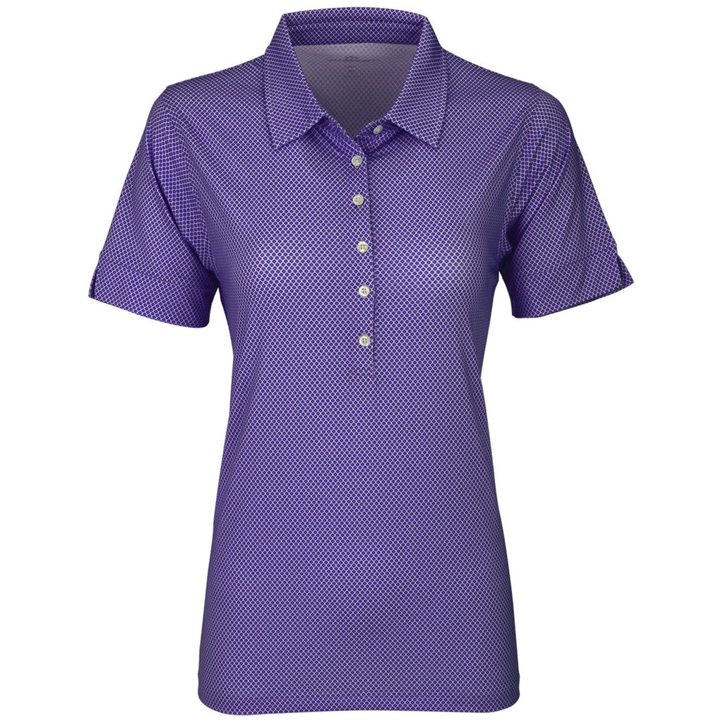 Design a custom embroidery for the Vansport Women's Purple/White Pro Eagle Polo to create an easy-to-wear look that is ready for the day. The short sleeve polo is lightweight, anti-microbial, and offers UV protection with an all-over diamond print. Hit the putting green, the back nine, or work in this versatile polo.