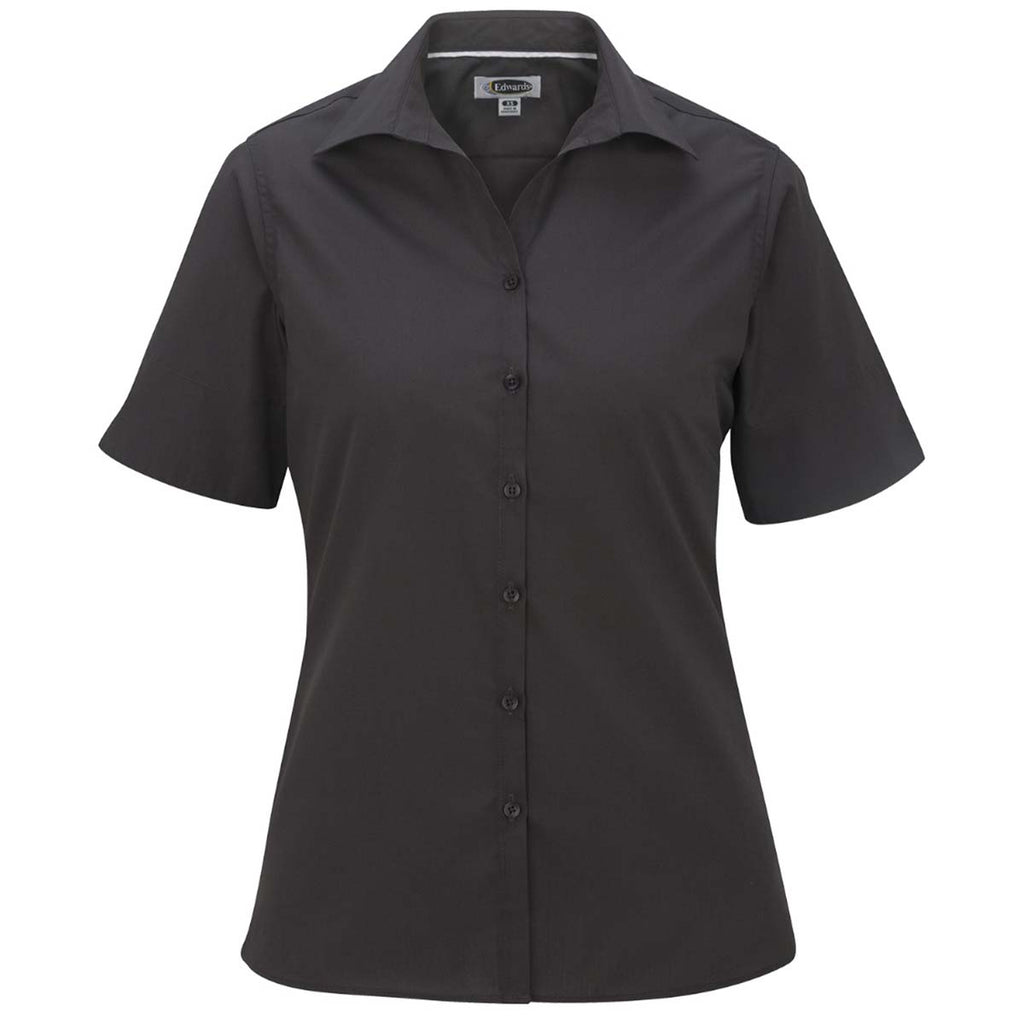 A custom dress shirt look with a comfortable feel comes together with the Edwards Women's Steel Grey Lightweight Short Sleeve Poplin Blouse. Made to stand up to the demanding wear of customer service or restaurants, these make great employee apparel for those that work the hardest. Add a custom logo and choose the color you like best as hospitality apparel. Made of polyester and cotton, this short sleeve shirt with matching buttons, countered seams, and open neck this shirt can easily go from the office to the sales floor and anywhere in between. Choose the color and embroidery you like best and place an order.Highlights