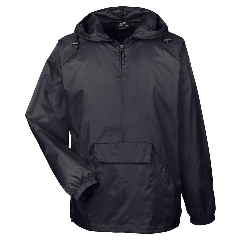 UltraClub Men's Black Quarter-Zip Hooded Pullover Pack-Away Jacket