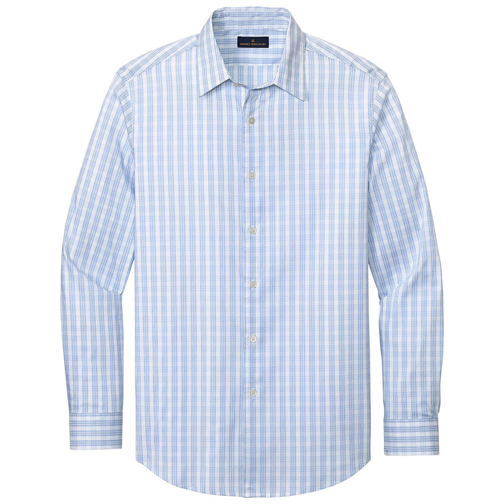 Brooks Brothers Men's White/Newport Blue Grid Check Tech Stretch Patterned Shirt with a custom logo will turn heads with the large checkered pattern that is sleek and stylish. The lightweight button-down is ideal for the office with a button-down collar, and adjustable cuffs. Great piece to complete any outfit. This is a must-have for every corporate wardrobe. Place an order today.
