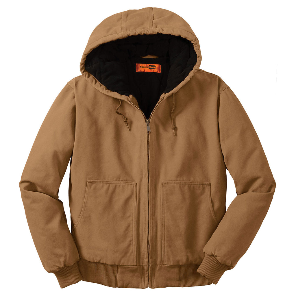 Construction workers that work outdoors in frigid climates need protection against the brutal elements. The CornerStone Men's Duck Brown Washed Duck Cloth Insulated Hooded Work Jacket provides the protection you need against frostbite. However, the insulated workwear also enhances your on the job comfort to make it a favorite among construction workers. The enzyme-washed hood jacket presents a subtle worn-in appearance that maintains the rugged durability of duck cloth. Eight-ounce polyfill provides the insulation that keeps you warm and removes perspiration to keep you comfortable throughout your workday. The uniquely designed hood includes antique brass eyelets and a dyed-to-match draw cord to create a jacket that turns the head of your fellow workers. Construction site managers promote their company by adding a custom logo on the left side of the chest.Highlights